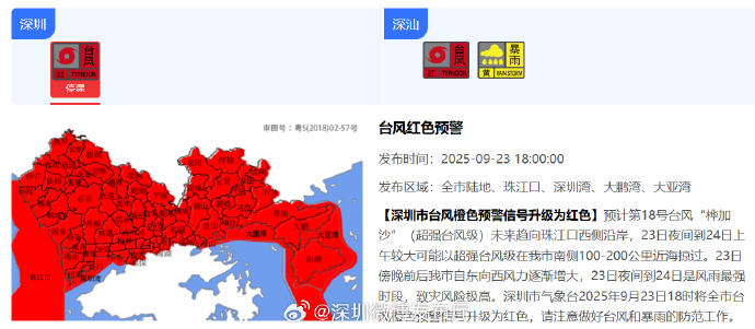 北京的消息根据深圳微博发行厅的说法,预计第18风暴“ Huagaza”(超级台风级别)将来将移至珠河河口的西海岸。从23日至24日晚上,它很可能被传递到深圳南部南部海岸的台风100-200公里的极端水平。深圳从东到西的风在23日晚上逐渐增加。从23到23日至24日,风和雨水最强,灾难的风险很高。深圳气象天文台已在2025年9月23日的18:00升级了该市的橙色型红色警告。请注意,防止风暴和大雨。编辑李Yilinzi