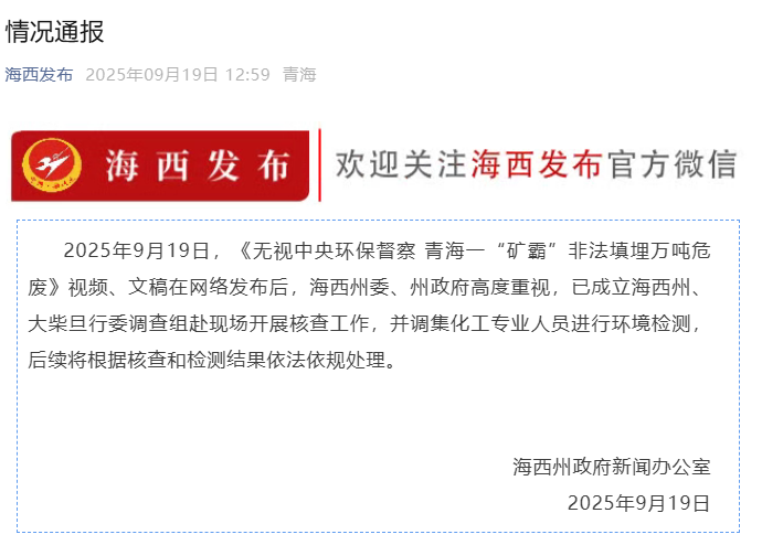北京新闻根据《官方微信》的官方对海克斯的官方报道的新闻,在2025年9月19日,在“无视中央环境保护检查的视频和手稿”之后,在Qinghai非法垃圾填埋场的“矿物暴政” 10,000吨危险的Garbage”在线发布了危险的Garbage”。海克西县和达切丹政府委员会的调查小组前往现场进行检查工作,并转移了化学专业人员进行环境测试。随后的处理将根据法律和法规根据身份验证和测试结果进行处理。编辑Xin Jing