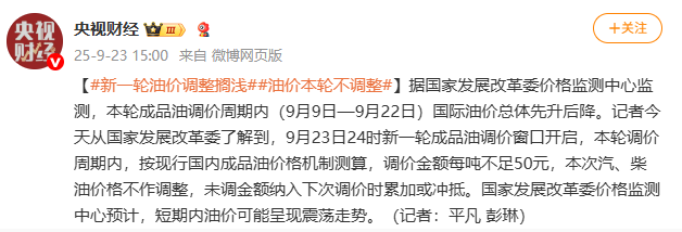 根据@CCTV财务微博的报道,根据对国家发展和改革委员会的监控价格监控的监测,国际石油价格首先上涨,然后在精制油价维修的轮换期间下降(9月9日至9月22日)。国家发展与改革委员会的记者今天发现,新近旋转的石油价格窗口于9月23日开放。根据当前的松石油价格机制,在价格调整期间,价格调整成本少于每吨50元。燃料和柴油价格未调整。不兼容的值将包括在下一个价格调整中。国家发展和改革委员会的价格监控价格监控油价可以在短时间内显示出Pabagu -Crangange。 (记者:Pingfan Peng Lin)编辑Xin Jing