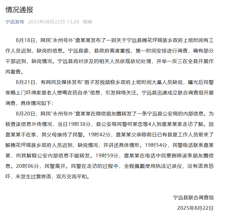 北京的消息于8月22日,匈奴省云州市宁乌恩县联合集团发布了有关这种情况的报告。 8月18日,“阳蒙”(Yongzhou)统治下的网民在纽约县的Yao民族乡镇政府的工作时间内发布了一条有关已故员工和空缺的信息。 Ningyuan县党和县政府委员会非常重视它,并尽快进行调查。一些干部确实很晚和空缺。 Ningyuan County将与规定和学科有关的相关人员打交道,并在整个县的榜样和进行工作风格检查中学习。 8月21日,一些网民和媒体发布了以下信息:“有人发布了一段视频,该视频说已经在与人民政府合作时已经消失了。在家中的成年人通过饮用农药自杀”,这引起了互联网的关注。纽约县迅速建立了一个联合调查团队进行调查。具体情况如下:8月20日,网络在Yongzhou号下“ Yongzhou号”。关于政府的迟到和缺乏种族,并解释了潘·穆莫(Pan Moumou)的特定情况。在整个过程中录音机,没有口头恐吓,没有过多的单词h发生了广告,双方之间的交流是和平的。编辑Xin Jing